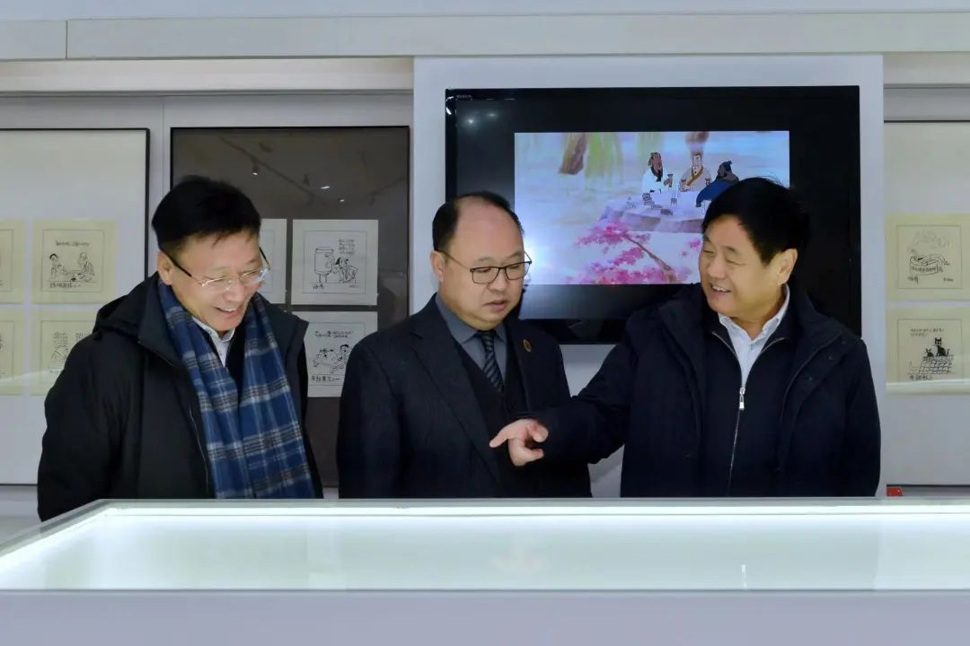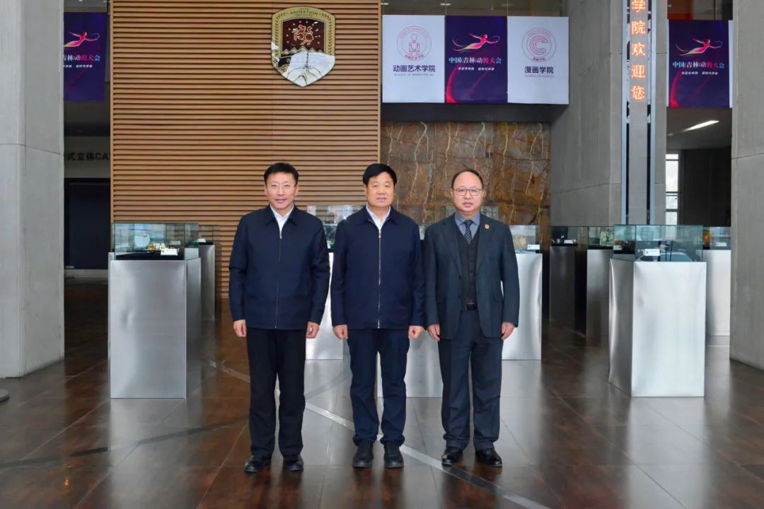在吉林国际动漫博物馆内,张伯军一行在《孔雀东南飞》《狼来了》《地雷战》《小山子的故事》等经典手稿作品前驻足品鉴。对手稿深厚的绘画功底,精美的线条描摹表示赞赏;在动画实践教学平台和学研产一体化创作成果展厅内,看到师生们创作的动画大电影《疯狂电脑城》、系列IP衍生品、红色漫画和“虚拟展馆”时,对学校学研产一体化的人才培养模式、深化产教融合的做法以及师生的创意作品给予高度的肯定。
