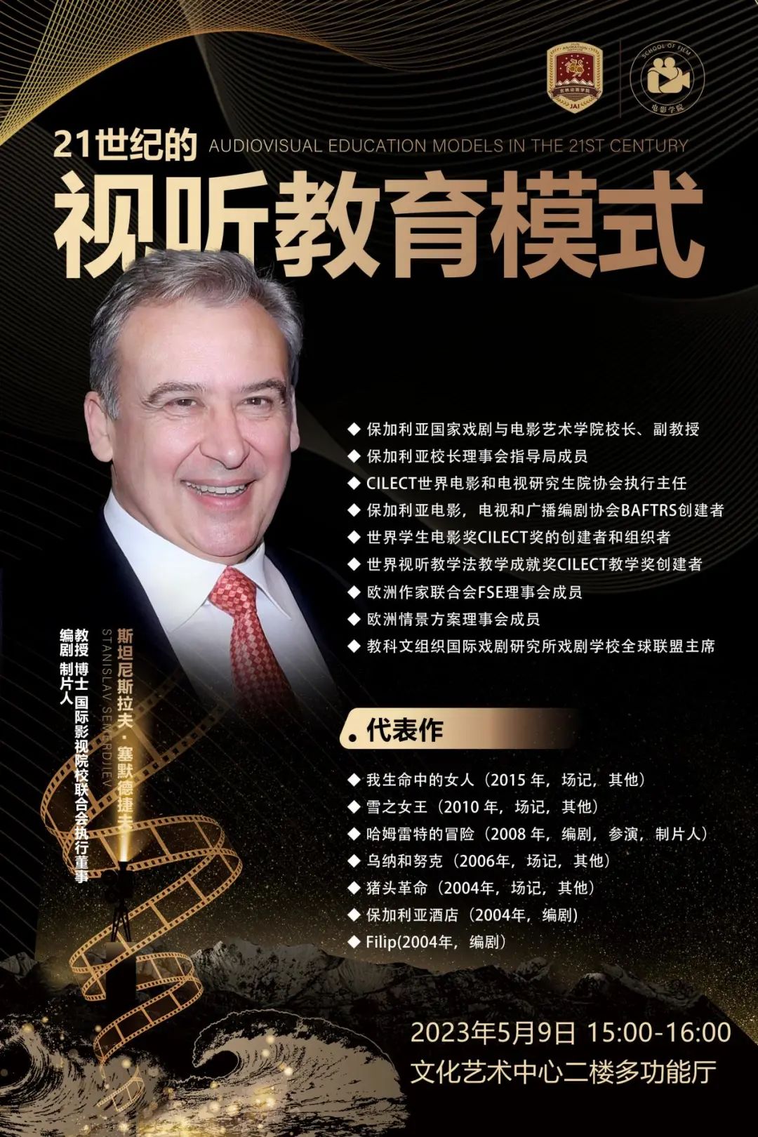 斯坦尼斯拉夫·塞默德捷夫教授1987年毕业于保加利亚国家戏剧与电影艺术学院,获得电影和电视戏剧理论和历史博士双学位。后续又在美国洛杉矶加州大学(UCLA)主修电影制作和剧本,1992年在德国慕尼黑大学深造,攻读剧本创作专业方向。现为保加利亚国家戏剧与电影艺术学院校长。他是保加利亚电影、电视和广播编剧协会BAFTRS创建者,世界学生电影奖CILECT奖的创建者和组织者,世界视听教学法教学成就奖CILECT教学奖创建者。其代表作有《Filip》《保加利亚酒店》《哈姆雷特的冒险》《我生命中的女人》《雪之女王》《乌纳和努克》等。