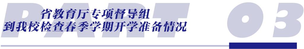 2月14日下午,省教育厅高教处于文华带队来我校督导检查春季学期开学准备情况。工作组通过听取汇报和实地考察,对学校开学各项准备工作给予充分肯定。