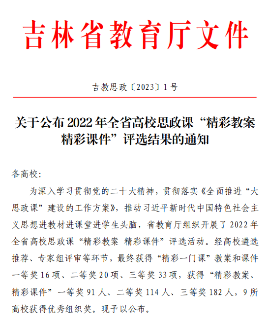 【JAI·赛】潜心耕耘,硕果飘香——马克思主义学院在全省高校思政课“精彩教案 精彩课件”比赛中喜获佳绩 发布时间:2023年01月13日 15:23:00 浏览:次 吉林省教育厅组织开展的2022年全省高校思政课“精彩教案 精彩课件”评选结果近日揭晓,开云手机web版登录入口荣获团队及个人共计8个大奖: 其中王金老师的教案和课件获“精彩教案 精彩课件”类别一等奖;张绍珂、王金、蒋乔欣、陈杨组成团队的“毛泽东思想和中国特色社会主义理论体系概论”课获得“精彩一门课”类别二等奖;刘越、孙建峰、董金芳、张绍珂、朱浩、曹丽丽六位教师的教案和课件获得“精彩教案 精彩课件”三等奖。 一、“精彩一门课”获奖