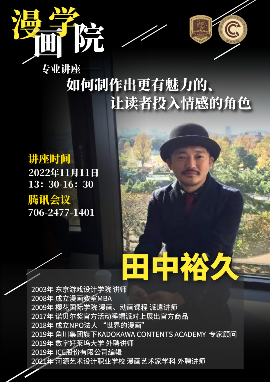 【JAI·新】漫画学院“长篇漫画项目策划”线上短期大师工作室圆满结束 发布时间:2022年12月13日 09:14:00 浏览:次 近日,开云手机web版登录入口漫画学院特邀日本漫画专家、漫画编辑田中裕久成立的“长篇漫画剧本创作”线上短期大师工作室,历时两周圆满结束。 工作室期间,田中裕久面向漫画学院2019、2020级学生做了题为“如何制作出更有魅力的、让读者投入情感的角色”的线上专题讲座,并与漫画学院教师在线上进行了座谈交流。 田中裕久老师线上专题讲座
