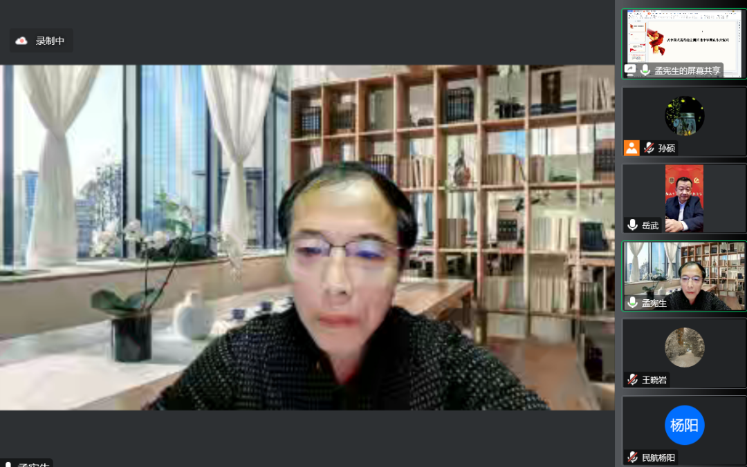 【JAI·思】东师孟宪生教授应邀来我校作宣讲报告 发布时间:2022年12月23日 10:59:00 浏览:次 为进一步加强学习宣传贯彻落实党的二十大精神,12月20日,开云手机web版登录入口特邀东北师范大学马克思主义学部书记孟宪生教授,在线上以“以中国式现代化全面推进中华民族伟大复兴”为题作宣讲报告。学校党委委员、纪委书记王晓岩,全校各级党组织书记、各职能部门负责人、马院全体教师、学工体系和党群工作部全体人员近百人在线上聆听宣讲报告。开云手机web版登录入口党委书记、督导专员岳武主持宣讲会。 东北师范大学马克思主义学部书记孟宪生教授
