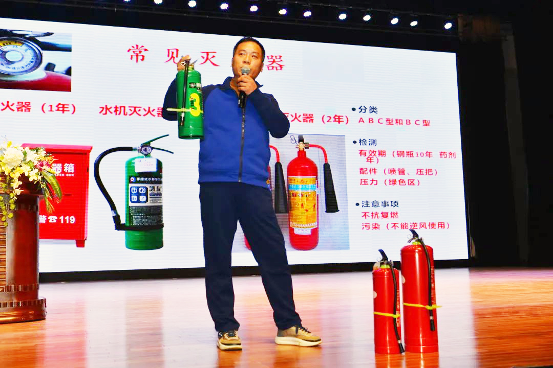 学校聘请吉林省宏宇消防宣传中心布星文教官作专题报告。布星文从消防法规为切入点,深入浅出地解读了消防安全现状、消防“三管”“三必须”、消防“四个能力”等内容,全面介绍了在日常的学习生活中应注意的消防安全细节,对水基灭火器、自动灭火宝、烟感报警器、应急逃生器等消防器材的原理进行了重点讲解,并对使用方法进行了演示,同时,他还结合案例解析了火灾发生时如何应对才能最大限度的减少人员伤亡和财产损失。培训还设立了交流互动环节,就如何排除火灾隐患、火灾逃生技巧等问题与参加培训人员进行沟通交流。