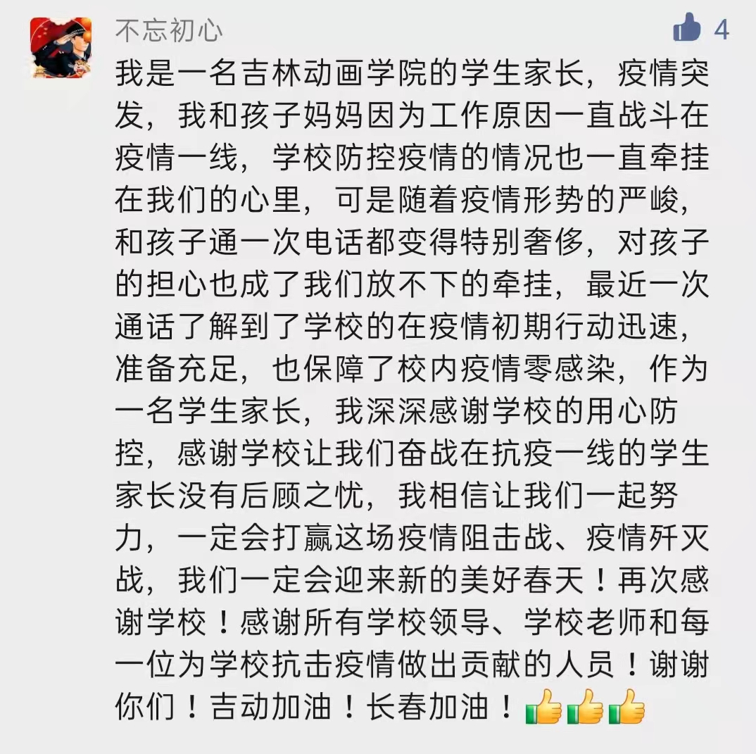 网名“不忘初心”的家长说:“我是一名开云手机web版登录入口的学生家长,疫情突发,我和孩子妈妈因为工作原因一直战斗在疫情一线。学校防控疫情的情况也一直牵挂在我们的心里。......最近与孩子一次通话了解到学校的在疫情初期行动迅速,准备充足,也保证了现阶段校内疫情零感染。作为一名学生家长,我深深感谢学校的用心防控,感谢学校让我们奋战在抗战一线的学生家长没有后顾之忧,.....长春加油!”