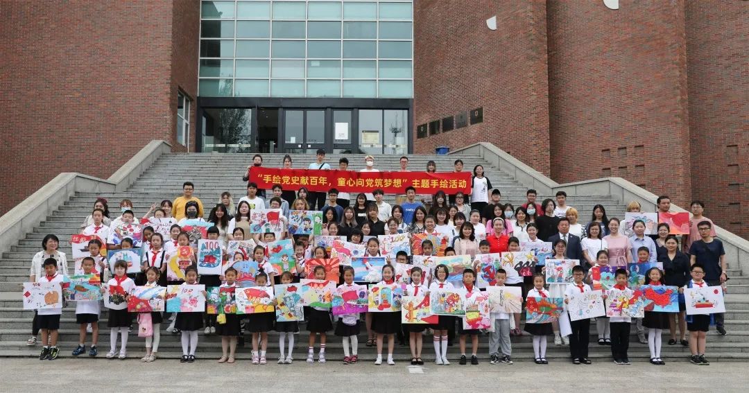 在活动现场,我校50名大学生和东北师范大学附属小学繁荣校区50名小学生共同创意、共同完成了50幅绘画作品。学生们用画笔描绘出了心中最美的画卷,表达出对中国共产党成立100周年的美好祝福:鲜红的党旗、雄伟的天安门、绵延的万里长城、秀丽的祖国山河……在学生的笔下一一呈现,形式多样,生动传神。