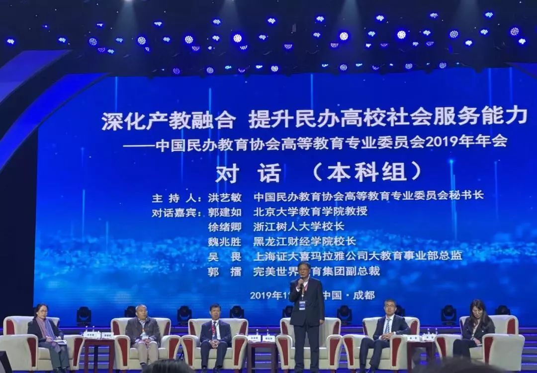 会上,中国高等教育学会副会长、教育部原副部长林蕙青,中国民办教育协会会长王佐书,教育部高教司吴岩司长,全国政协常委、四川省政协王正荣副主席等相关领导发表讲话。大会还邀请了在民办高校产教融合、服务社会方面有着深入实践和研究的高校校长、行业企业专家和理论研究者以对话的形式,分本科和高职两个组与参会代表进行对话互动。