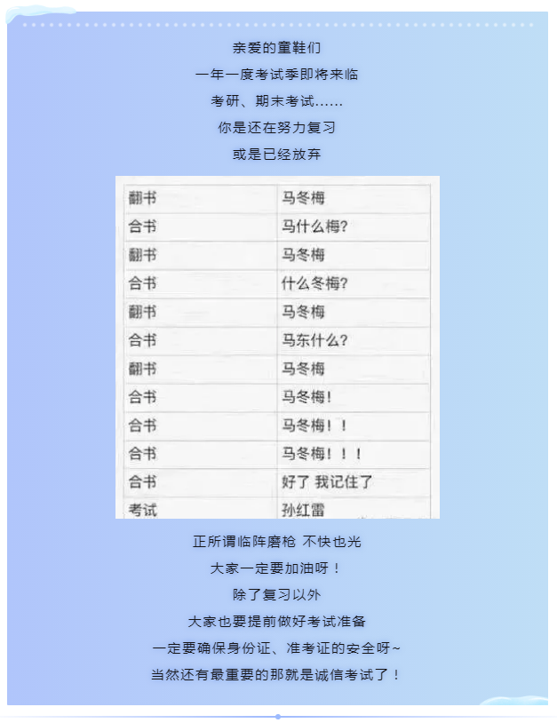 2020年全国硕士研究生招生考试将于2019年12月21日、22日进行,同时校内期末考试也陆续开展。为进一步教育学生遵纪守法、诚信考试,严格考试纪律,保证考试的严肃性和公正性。要求下: