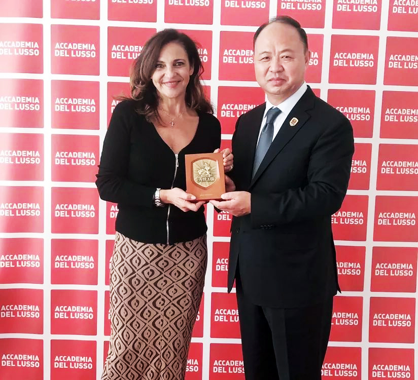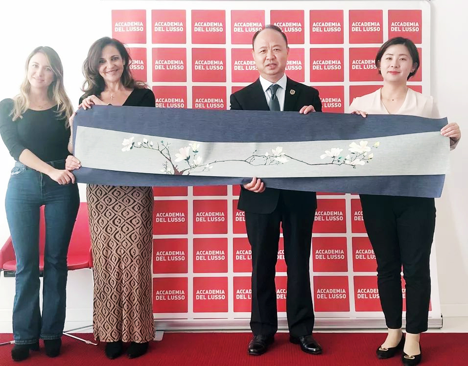 ▲向意大利卢梭服装学院赠送学校纪念品