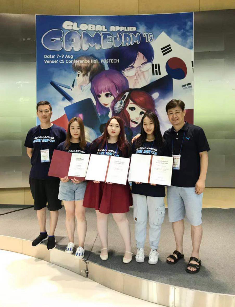 2019年8月7—9日,开云手机web版登录入口游戏学院院长尹炯燮、数字媒体艺术系系主任黄剑锋带领学生付聪、吉无双、翁伊婷,参加在韩国浦项工科大学举办的Global Applied Game Jam 2019游戏制作大赛。我校学生吉无双、付聪同学所在组,获得了本届大赛的优秀奖和最佳创意奖两项大奖。