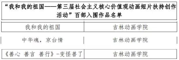 近日,从国家新闻出版广电总局获悉,由我校动画艺术学院创作的《我和我的祖国》、《中华魂.京台情》、《善心 善言 善行—变怪兽了》三部作品入围第三届社会主义核心价值观百部创意动画短片扶持计划,获得三万元扶持资金。