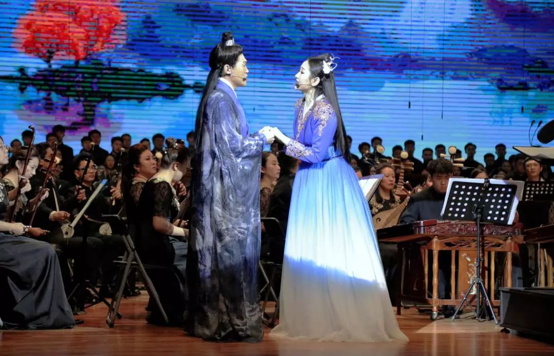 高山巍巍,碧水盈盈。吉林艺术学院青年国乐团精彩绝伦的演奏演绎出了一个陷入爱河少女的内心悸动:“君声切切,闻之念念;君心灼灼,其意昭昭。相伴长长,相顾久久。相识邈邈,相知迢迢。”二胡、提琴、琵琶以及扬琴等乐器的完美配合,将表情达意演绎到了极致,引得观众席传来连绵不绝的掌声。“长白青青,此恋绵绵;天池滟滟,此情涟涟。”在这样舒缓动人的乐声中,两人许下永不分离的诺言。