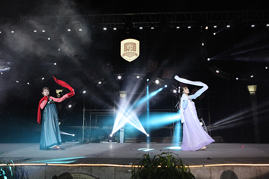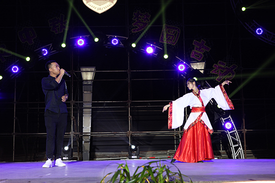 秋风送爽,中秋月圆。电视与新媒体学院、电影学院的歌伴舞《莫尼山》,以浪漫、深情的方式祝福所有在场的领导、老师、同学们中秋节快乐。由动画艺术学院选送的节目《V家缭乱狂欢》和幻醒旅团的cosplay表演《野良神》一登场就引起了全场的欢呼声,逼真的人物造型、细致的布景道具,受到了现场观众的热烈欢迎,同学们纷纷挥舞手里的荧光棒,现场掌声、欢呼声此起彼伏。