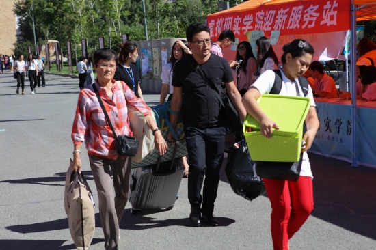 新生大多都有家长的陪同,有的学生甚至有“亲友团”陪送,从白发苍苍的老者,到牙牙学语的婴孩,校园里上演了一场“合家欢”。“孩子第一次出远门,我们实在不放心,加上行李又多,他自己坐火车肯定拿不过来。正好我们也没来过东北,就当是旅游了”,来自上海的新生家长说,孩子从小在父母的呵护下长大,很多事情都不知道该怎么处理,家长跟着一起来,除了可以保障孩子的安全,也可以让报到过程更顺利一些。