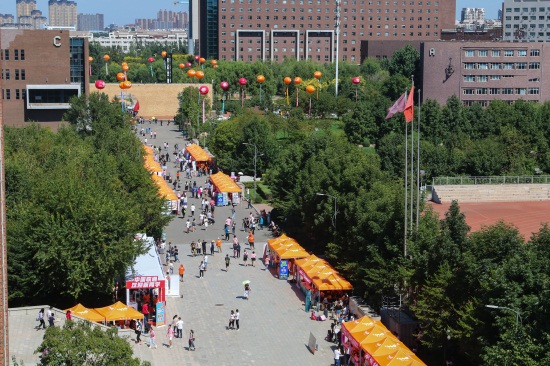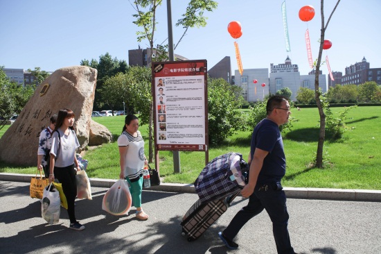在学校的中央大道两旁,十个学院都设立了报道点,家长可以在遮阳棚下休息,新生则在学长的指引下前往图书馆办理入学手续。各学院的领导几乎都在自己学院的接待现场坐镇。电影学院院长、著名电影导演宋江波对常务副院长李伟华兴奋地说到:“原来导演专业和摄影专业都计划招生30名,现在两个专业实际招来的学生都是47名,真是形势大好啊。”