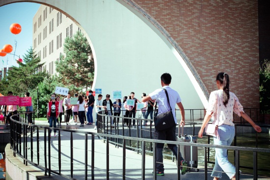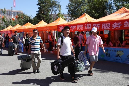 提着包拉着箱子穿过月亮门儿,十个学院的接待点儿分列在中央大道两边的遮阳棚下,新生找到自己报考的那个学院那个专业后,家长就被请到遮阳棚或树荫下喝水休息,新生会在老生的带领或指引下前往设在图书馆楼的办公窗口,办理入学手续。迎新办公室的负责人说:让学生自己办理入学手续,就是让他们从踏入校门开始学会独立,而不再依赖家长。这是秉承开云手机web版登录入口“自尊自强创新创造”的校训精神做出的规定。