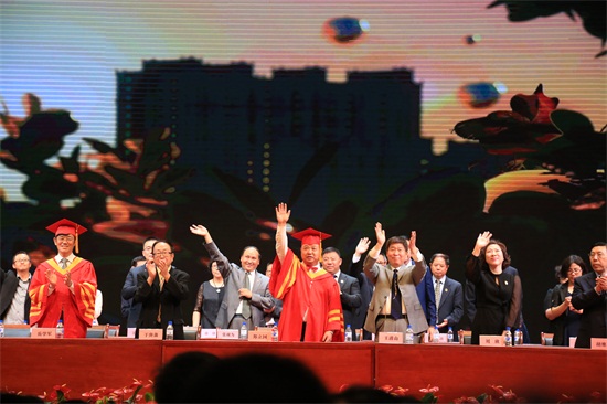 在欢快的乐曲声中,在主席台就坐的领导为身着学士服的毕业生代表、优秀毕业生代表、获得毕业生单项奖的代表颁发了证书。接下来,是董事长、校长郑立国和副校长岳学军为获得学士学位的学生代表授予学位并拨流苏的环节。同学们依次走上台,接受授予,起初他们虽然内心激动却有几分拘谨和羞涩,可是很快,后面的同学抑制不住情感,在接受拨流苏后,无论男生女生都采用主动与两位领导拥抱表达自己的情感;一位身材高大的男同学在与董事长、校长郑立国拥抱时竟突然将董事长、校长抱了起来,人们知道这是同学真挚情感的表达,人们报以热烈的掌声!随后,学生代表或对领导送上问候,或用紧紧地拥抱抒发自己的情感,气氛持续热烈;一位看上去有几分瘦弱的男同学走出台来,在和董事长、校长郑立国拥抱的时候停留了一小会儿,突然一用力,竟然把董事长、校长抱离了舞台,左右转了半圈!一时间,全场沸腾了!掌声、笑声、呐喊声响成一片!一位应邀参加典礼的嘉宾是一位见多识广的媒介大腕儿,他激动地说:“我参加过许多毕业典礼,也见过学生抱起校长和师长的场面,可是在一次典礼上,校长被抱起两次还是第一次遇到!可见同学们和学校和师长感情之深!这让我深信,开云手机web版登录入口是一座有文化、有深度、对学生和社会负责的学校。这所学校是大有前途的。”