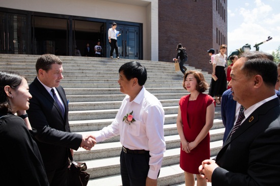 吉林省政协副主席、吉林省教育厅厅长张伯军(左三)法国驻沈阳总领事马克•拉米(左一)董事长、校长郑立国(右一)和副董事长、副校长刘欣(右二)(刘子铭 摄)
