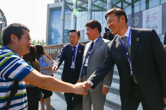 董事长、校长郑立国与中国著名漫画家、《漫友》杂志主编金城亲切拥抱(刘子铭 摄)