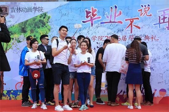 拍照结束,同学们陆续来到艺术中心的门前。那里可是有重头戏正等着他们呢!学校为同学们搭建了一座铺着红地毯的长长的T型台,四个不同颜色的拱门依次排开,四个拱门象征着难忘的四个年头。同学们开开心心地在拱门下拍照留念,并在留言板上重重地描下自己的名字,留下他们与母校的共同记忆。