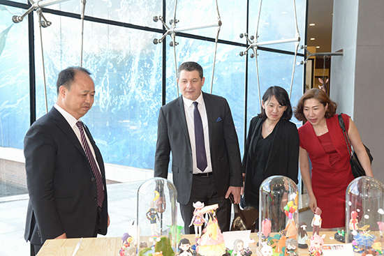 董事长、校长校长郑立国(左一),副董事长、副校长刘欣(右一)陪同法国驻沈阳总领事马克•拉米先生(左二)参观展览