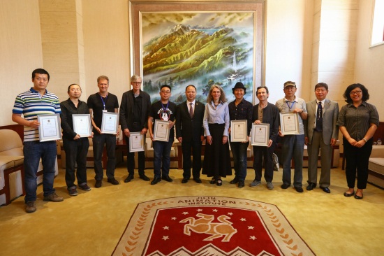 会谈结束后,郑立国董事长为8位漫画家、剧作家颁发了客座教授聘书,并欢迎各位专家来校交流、授课,成为永久的朋友与合作伙伴。