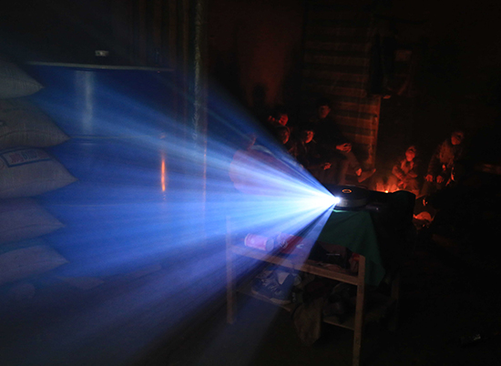 围在火堆旁的孩子们越来越多,每隔一会儿就会有一个孩子起身去拉电灯的绳子,看看有没有来电,瞬间想起了自己小时候看电视很期盼来电的时候。晚上7点半,忽然灯亮了,火堆旁的孩子们瞬间开心起来,“流动的动画电影院”上演……