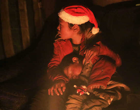 12月24日傍晚6点多到达村子,遗憾的是村民家停电了,孩子们在火堆旁开心地玩着圣诞老人玩偶,对他们来说停电是司空见惯的事