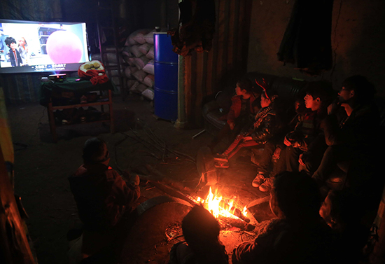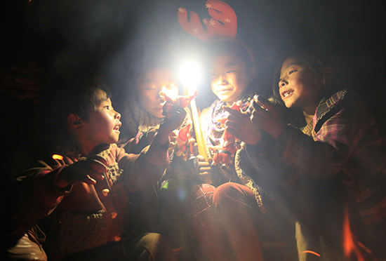 12月24日晚7点半,村名家忽然来电了,孩子们围在火堆旁看电影