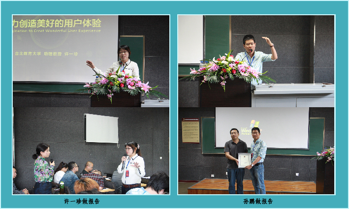 台北教育大学助理教授许一珍女士,带来了关于“想象力创造美好的用户体验”报告,许女士首先以“大”为命题与师生进行互动展开想象,讲解了用户体验的基本理论以及想象力对未来科技的影响力。通过“数字生活互动”的视频展示了想象力启发科技创造所带来的完美用户体验,不仅夺人眼球,更最大限度地激发了同学们的想象力。