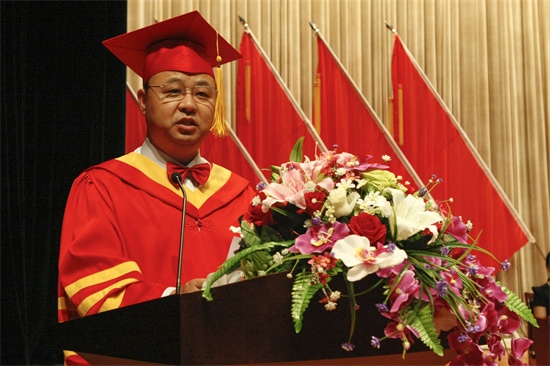 “过去的四年,你们见证并推动了学校蓬勃发展。今天,你们即将告别母校,投身到一个日新月异、风云变幻的时代。国家的发展,社会的变革,互联网对一切事物颠覆性的改变,信息化、智能化的到来,改变了人们的生活方式,不断创造新的产业模式,促使新兴产业发展步伐不断加快……创新已经成为社会发展和变革的主要驱动力,文化创新是一个民族发展的核心动力,中华民族优秀传统文化需要传承,更需要创新。作为文化创意产业人才,你们的创新思维、创意理念,创造精神,正是这个时代迫切需要的,你们有得天独厚的优势和条件。”他同时希望同学们在事业发展上不要好高骛远,导致梦想半途而废。在人生道路上,守住底线,做一个有社会责任感的人。并且珍惜缘分,让美好的同窗情谊伴随一生。