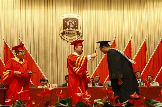 董事长、校长郑立国,总督学、学位评定委员会主任于庚蒲为获得学士学位的毕业生代表授予学位并拨流苏
