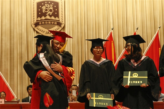 在欢快的音乐声中,学校领导为毕业生代表颁发毕业证书,为优秀毕业生代表颁发优秀毕业生证书,为获得毕业生单项奖的代表颁发证书。学校董事长、校长郑立国和总督学、学位评定委员会主任于庚蒲为获得学士学位的毕业生代表授予学位,并颁发学位证书。