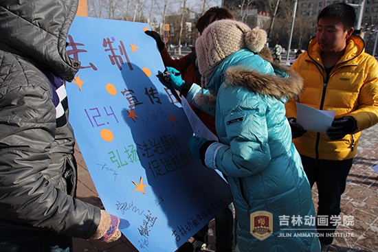 2014年12月4日是我国第一个宪法日。为了普及法律知识,弘扬法治精神,创建法治校园,促进社会和谐,动漫分院分团委学生干部于12月4日上午到高新区三佳社区周边进行普法宣传活动。