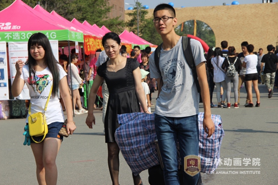 一名数字媒体技术专业的男同学在姐姐和妈妈的陪伴下步入校园,在上海上学的姐姐不远万里前来相送,走在中央大道上,他们的脸上荡漾起幸福的笑容。