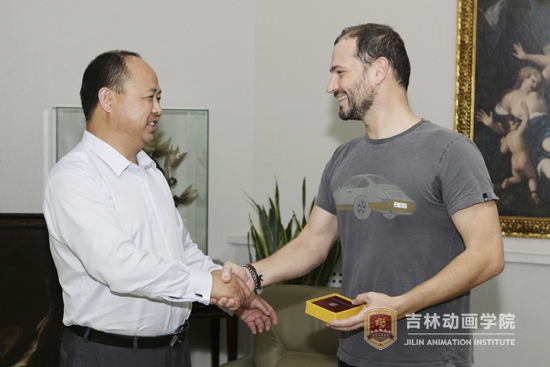 7月8日,郑立国董事长热情地接见了亚历克斯·韦特导演,代表学院、公司对亚历克斯·韦特莅临本院担任《青蛙王国Ⅲ》前期导演表示欢迎与感谢,希望通过双方的精诚合作,使3D动画电影《青蛙王国Ⅲ》迈上新的台阶。郑立国董事长介绍了学院、公司以及《青蛙王国》系列动画电影的基本情况,当郑立国董事长谈到吉林禹硕公司正在进行《青蛙王国Ⅳ》前期创作时,亚历克斯·韦特导演对于剧情、影片中涉及到的各类运动元素、人物设定表示出了浓厚的创作热情,表达了希望可以继续做《青蛙王国Ⅳ》编剧和导演的渴望,双方就《青蛙王国Ⅲ》、《青蛙王国Ⅳ》的剧情、人物设计、故事板、主题曲等方面进行深入的交流与探讨。