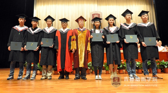 学院院长于庚蒲与动漫分院院长武立杰为获学士学位的学生颁发证书
