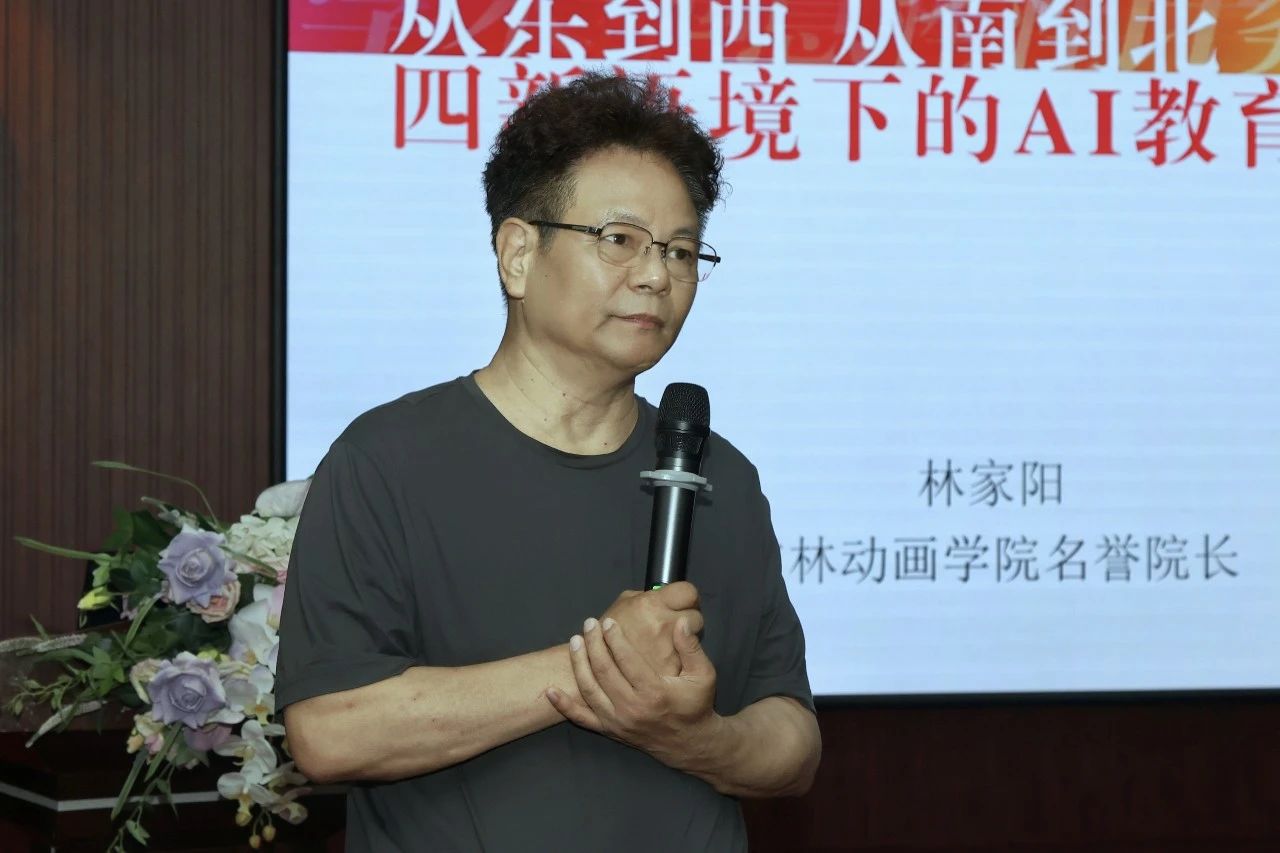 林家阳教授以《从东到西从南到北》为题,以自身成长经历为切入点,引用恩格斯名言“社会上一旦有技术上的需要,则这种需要就会比十所大学更能把科学推向前进”,从教育的责任和义务,艺术创新与社会创新和科技创新以及四新语境下的AI教育转型,他集中讲述了跨界学习的重要性以及产教能力与多元融合的重要性。