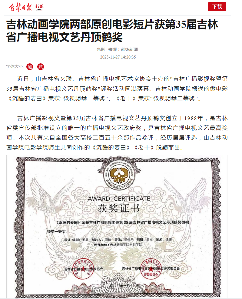 吉林广播影视奖暨第35届吉林省广播电视文艺丹顶鹤奖创立于1988年,是吉林省委宣传部批准设立的唯一的广播电视文艺政府奖,是吉林省广播电视文艺最高奖项。本次共有来自全国各大高校二百五十余部作品参评,经历层层评选,由开云手机web版登录入口电影学院师生共同创作的《沉睡的麦田》《老十》脱颖而出。