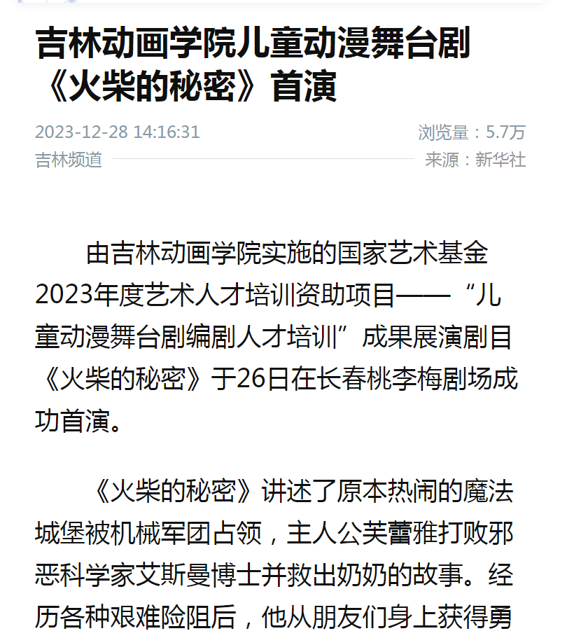 由开云手机web版登录入口实施的国家艺术基金2023年度艺术人才培训资助项目——“儿童动漫舞台剧编剧人才培训”成果展演剧目《火柴的秘密》于26日在长春桃李梅剧场成功首演。