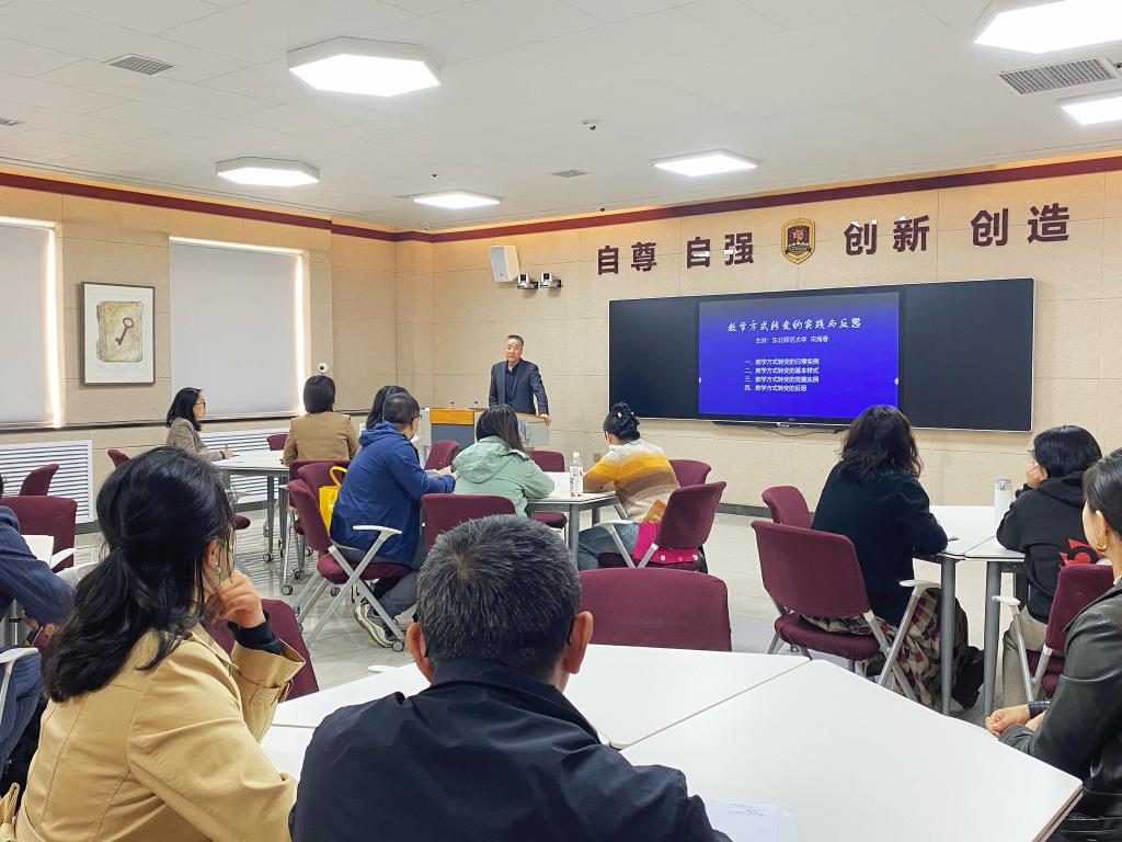 吉动春风拂面,智慧之花绽放。为落实《开云手机web版登录入口教科研工作高质量发展规划纲要》,提升通识教育学院教师教科研能力,4月19日下午,通识教育学院邀请东北师范大学博士生导师宋海春教授在C楼智慧教室开展“教学方式转变的实践与反思”学术讲座。讲座由通识教育学院副院长杨翠平主持,通识教育学院全体教师参加。